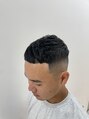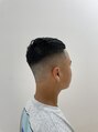 フェードスタイルの中でも人気なクロップスタイル。表面はジェルバームをつけて粗刃のコームで毛流れをつけてセット。クロップ特有の前髪にラインを出して完成。写真は0.8mmスタートです。