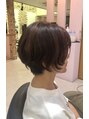 癖があり一定の長さを超えると纏まりにくくなります。ワンカールの位置でカットし癖の収まりを活かした柔らかショートボブ。顔に沿う事で小顔効果を☆顔周りに白髪が固まっているので白髪暈しブリーチONカラーで伸びてきても分かりにくいピンクブラウンカラー