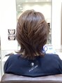 バックのアウトラインが肩に少し付くレングスで全体にレイヤーが入ったミディアムウルフスタイルです。サイドやフロントのアウトラインはお好みでレングスを決める事が出来ます。パーマをかけるとナチュラルな外ハネや動きが出ます。