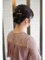 サイドに後れ毛を残した柔らかい雰囲気の編み込みアップスタイル。華やかなゴールドとパールのアクセサリーを添えることで、特別な日の装いを一層引き立てます。結婚式やパーティーに最適な上品で華やかなヘアアレンジです。