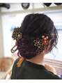 普段も楽しめるようにイヤリングカラーに赤のエクステを入れてシニオン部分に出るようにデザインカラーがしっかり目えつつ、こだわりの髪飾りも映えるように配置