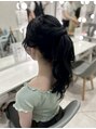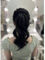 重たく見えがちな黒髪ロングヘアを、ポニーテールでゆるーく作って軽く見えるように仕上げました。