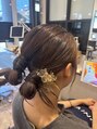 すっきりとまとめたカチモリアレンジに、華やかなアクセサリーをプラスした結婚式仕様のヘアセット。落ち着いた上品さと華やかさを兼ね備え、和装・洋装どちらにもマッチします。後れ毛を残すことで柔らかさも演出。大切な日の特別なスタイルにおすすめです。