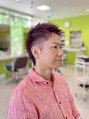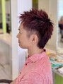 マレットヘア。サイドはまだ暑い日が続くので刈り上げして、ザクザクした質感にして、つやのあるワックスで仕上げました。細かくブラックのローライトを入れて、動きをつけながら、赤味に深みを与えました。このブラックは褪色してなくなるタイプ。