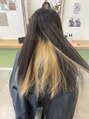 全体は落ち着いた暗めのトーンで、耳かけや動いた時にちらっと見えるインナーカラーがポイント。仕事や学校でも挑戦しやすく、普段のお手入れも簡単なデザインカラーです。