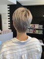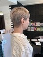 ベリーショートです。ダブルカラーの履歴があり抜けた色に黄ばみを取るシルバーを入れました。大人のハイトーンカラーも人気です!!