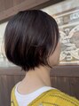 軟毛でまとまりにくい髪質とクセを活かし、ふんわりと動きを出したショート。襟足は軽く整えて自然な動きに、全体は丸みのあるシルエットで収まりよく。