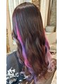 「チラ見えで映える!ピンク×パープルのインナーカラー」暗めのベースカラーに、ピンクとパープルをミックスしたインナーカラーで個性をプラス動くたびにチラッと見えるカラーが可愛く、巻き髪との相性も抜群◎