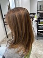 トップを中心にハイライトを入れ白髪を馴染ませて目立たなくするスタイル ハイライト後、根本をリタッチしてシャンプー台で毛先にカラー剤を馴染ませるのでダメージを最小限に抑えます