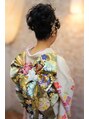 白地の振袖に映える華やかアップスタイル。大きなピンクの髪飾りとパールで可憐さをプラスし、成人式を上品に彩ります。