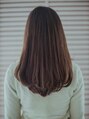 重ためカットベースのワンカールスタイルです。カラーはツヤがでやすいナチュラルブラウン系です。清楚感を出すため、パートはセンターにして長めのバング設定にしています。毛先の重さを残すためレイヤーはトップに少しだけ入れました。