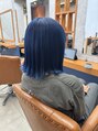 ケアブリーチでしっかりベースを作ってからディープブルーのカラーで染めたデザインです!場合によっては2ブリーチが必要になるスタイルになります!