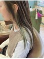 耳まわりにさりげなくグリーンを効かせたインナーカラー。落ち着いたベージュ系のベースカラーとのコントラストで、動いたときや耳掛けしたときにおしゃれ感が際立つ、遊び心あるデザインです。