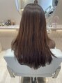 重めロングを、顔まわりレイヤーと毛先の動きで軽やかにチェンジ。透明感ブラウンで艶をプラスし、巻くだけで立体感のあるスタイルに。伸ばし途中の方や、顔まわりに動きを出したい方におすすめ◎