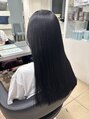 髪質改善縮毛矯正。カラーのムラなどはブルーを少し入れたブラックで染め直しています。ホームケアはオージュアなどの髪に合うものがおすすめです。