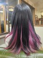 ブリーチを全体にしてある状態の髪に、インナーカラーの部分は少しパープルを混ぜたピンクを濃いめに入れ、上の部分はブルーとシルバーをベースとしたブラックに配合してあるので、光を吸収する柔らかい漆黒になります。
