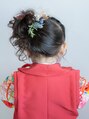 髪の毛が少ない3歳でもかわいいと人気NO.1♪七五三3歳被布着物のアップヘアアレンジ♪アシンメトリーにまとめて髪飾りでボリュームUP♪七五三七歳振袖(四つ身)にも*仕上げに使用しているオリジナルの和装髪飾り( @soieforhair )は、サロン店頭や WEB S