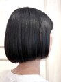 髪質改善METEOストレートMETEOカラー頭と顔が小さく毛量がとても多い。ウネリクセが強い。今回は部分的にストレート。個性を活かす為のブルーをベースのグレーブラック。前髪はラウンドに短くしての前上がり姫カットボブ