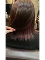 正面から見た時に、顔まわりにメリハリが出るようにフェイスライン&襟足内側に一度ブリーチをしてレッドピンクをオン!ベースの表面はブリーチ無しで赤みがしっかり出るようにしました。カットは肩少し下のボブでかわいらしくコテで外ハネに♪【ウルフ】