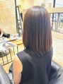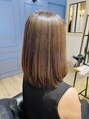 肩にかかるぐらいのミディアムの長さで、毛先は内に入るようにカット、髪質改善ストレートでダメージレスでストレートヘアに。艶も出て収まりもよくなります。