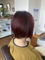 カラーリングには特殊染料を織り交ぜまて、明るいピンクレッドを発色。ネープはタイトにカットしてサイドの毛流れが強調されたボブスタイルです。