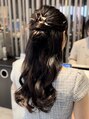 ハーフアップアレンジ。リボン風のおだんごとゆったりカールで女性らしいヘアに。