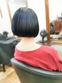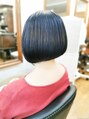 重めボブです。ほぼワンレングスです。ブルー系のカラーが入っています。