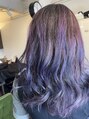 毎月の白髪染めをもっと楽しんで頂く為 一年に一回毛先をブリーチさせて頂いております 今回は バイオレットにところどころ ブルーとピンクが入っておりますワクワクして頂けますよ