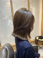 外はねボブにオリーブベージュカラーを合わせた、大人可愛いスタイル。軽やかに外に動きをつけることで、ボブでも抜け感のある雰囲気に仕上がります。オリーブベージュは赤みを抑えて透明感を引き出すので、肌なじみが良く柔らかい印象になります。