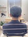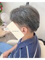 サイドから襟足までぐるっと短く刈り上げ、トップはうしろへ手ぐしで流してラフに。白髪は隠さずに活かし、ファッションカラーで明るくマットにお染めすることで、透明感のあるお色に。スタイリング剤は使わず、ナチュラルで自然体な大人男性のショート。