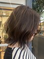肩スレスレのレングスのボブスタイルに、長めのバングから表面にレイヤーを入れたスタイル。結べる長さ、かつ、レイヤー部分を巻けば動きとくびれができるシンプルだけど、普通すぎないスタイルです。カラーは透明感と艶のある上品なチョコレートブラウン。