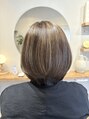 シャープに見える様、前下がりベースのレイヤーショートボブにカットしました。白髪ぼかしハイライトはしっかり目に入れて、全体的にマット系の色味に仕上げました。