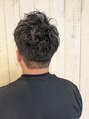サイドはツーブロックで周りを6mmで刈り上げ、前髪をかきあげやすいようにカット。ワックスをつけなくても自然に仕上がるようにパーマをかけました。