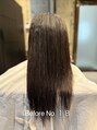 ・お客様の施術内容。今回は【超高濃度水素縮毛矯正】を施術しました。髪の内部からアプローチし、乾燥やダメージによるパサつきを抑えてツヤを引き出すメニューです。特に今回のお客様は「ツヤがないこと」が一番の悩みだったため、艶感を重視しました。