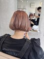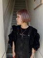 ほんのり透け感のあるペールピンクとコンパクトなミニボブ。首元すっきりで、シンプルなのにオシャレ見えする万能スタイルです。・人と少し違う雰囲気を楽しみたい方・ボブにマンネリしてきた方・首元をすっきり見せたい方にオススメのスタイルです