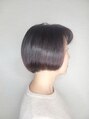 ディスコネクションボブ。バック内側は刈り上げ、かぶせたラインはショートボブ。明るいヘアマニキュア施術。
