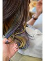 ボブスタイルに中側はブリーチをしてインナーカラーを入れました!インナーカラーは多色染めで寒色系5色入れた中でアクセントカラーでイエローをいれこみました!