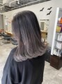 赤みをしっかり抑え、透け感たっぷりに仕上げた 透明感グレージュカラー。根元から毛先にかけて自然なつながりをつくる エアータッチバレイヤージュグラデーションで、柔らかく立体的なスタイルに仕上げました