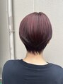 カットはえりあしをスッキリ。トップは自然にふんわりするようにレイヤーを入れました。サイドは耳にかけれる長さで、量は軽くして、もたつかないように。カラーはボルドー系のレッドカラー。