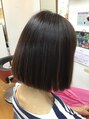 アゴ下ラインのショートボブ。縮毛矯正後4ヶ月経っています。7レベルのナチュラルブラウンでの白髪染めです。トリートメント処理後ブローのみで仕上げています。