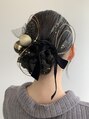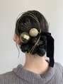 低めの位置でシニヨンでまとめて、水引き、黒のベロアリボン、ゴールドを基調とした髪飾りで仕上げました☆