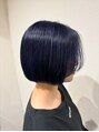 全頭ブリーチで19トーンまで明るく抜き、ブルーブラックをオン。透明感と深みを両立させた大人っぽいクールなスタイルに仕上げました。