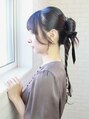 カチモリヘアです。低めの位置でまとめ、髪でリボンヘアにしてあります。バランスをとりつつ、毛先の一部をカチモリに。細めのみつ編み、ツイスト編みを加えて下にたらして、ニュアンスをつけました