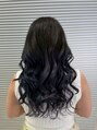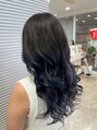 暗髪ベースにブルー×バイオレットをプラスした透明感カラー。光に当たるとさりげなく色味が映え、上品でおしゃれな大人ロングスタイルに。