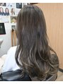 ケアカラーで秋らしい黄色味を抑えたアッシュグレー系にカラーしました。根元は明るい白髪カバーをしています。ベースにバレイヤージュでブリーチしています。毛先のダメージも考え今回は明るさを抑えたグレー系カラーがいい感じです。
