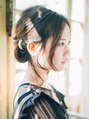 顔周りに少し多めにおくれ毛を残したルーズなアップスタイル。バックは表編みにして下方で毛先をしまいこむようにロール状にまとめています。正面からがルーズな分、バックはすっきり綺麗にまとめるとバランスが良いです♪【いわき】