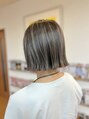 ハイライトブリーチを行い、肌色を良く見せるヘーゼルベージュの色味で仕上げた切りっぱなしボブのスタイルです。アイロン使っています。白髪率に応じて相談可能です。