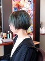 以前のブリーチ部分を活かしたカラーデザイン。シンプルなグラデーションボブにアクセントを効かせて。