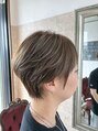襟足短めのカジュアルショートです。耳掛けも、もみあげを下ろしても可愛いスタイルになっています。