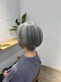 グレイヘアにローライト(暗い色の筋)を入れて白髪を立体的に見せたショートヘア